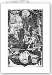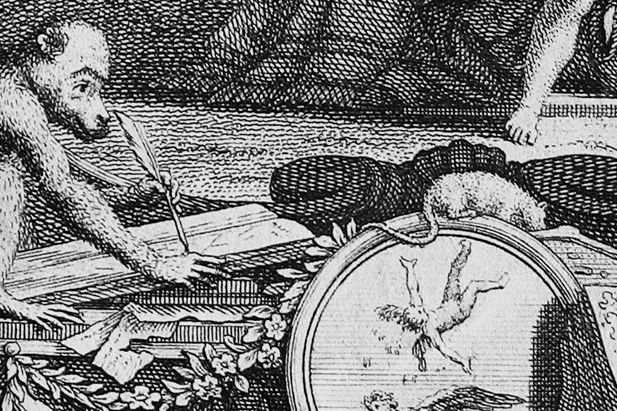 In the foreground a monkey ape doing the accounting books finances, rats coming out of the treasure chest (treasury) and unpaid bills (in Dutch: "onbetaalde rekeningen"). On the medaillons a falling Phaethon and Icarus.